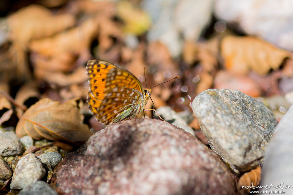 Korsischer Perlmutterfalter, Argynnis elisa, Edelfalter (Nymphalidae), endemisch, Tier trinkt am Ufer eines Baches, Lozzi, A nature document - not arranged nor manipulated, Korsika, Frankreich