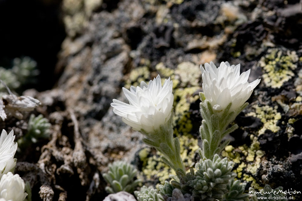 Korsisches Edelweiss, Helichysum frigidum, Asteraceae, endemisch, in Felsspalte zwischen Flechten, Aufstieg zum Lac de l'Oriente, Korsika, Frankreich