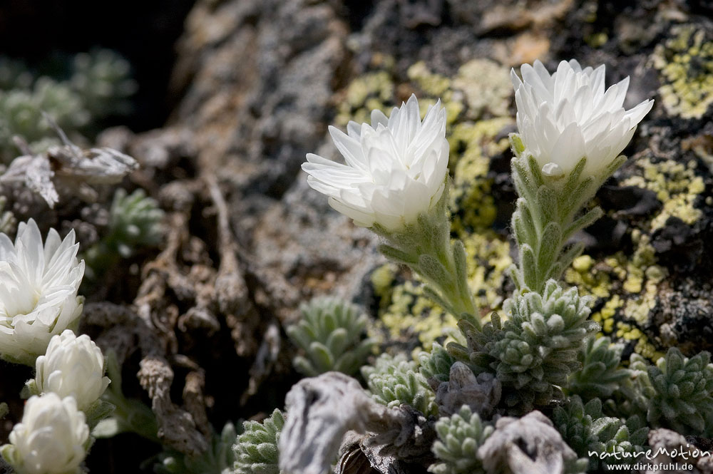 Korsisches Edelweiss, Helichysum frigidum, Asteraceae, endemisch, in Felsspalte zwischen Flechten, Aufstieg zum Lac de l'Oriente, Korsika, Frankreich