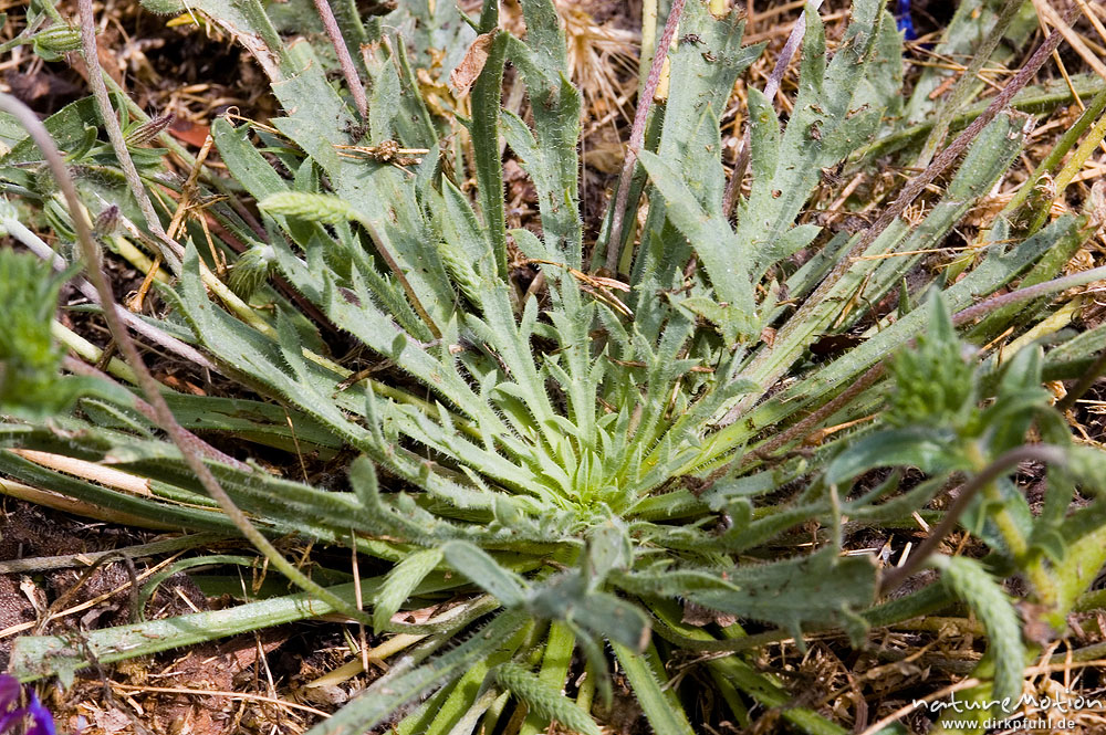 Krähenfuss-Wegerich, Plantago coronopus, Plantaginaceae, Blattrosette, Wiese, Campingplatz Ascaghjio Korsika, Frankreich
