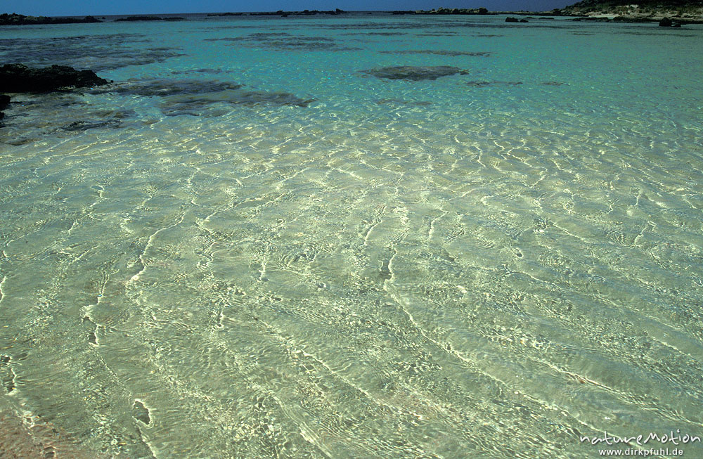 kräuselnde Wasseroberfläche am Strand, Lichtreflexe, roter Korallensand, Strand von Elafonissos bei Sugia, Kreta, Griechenland