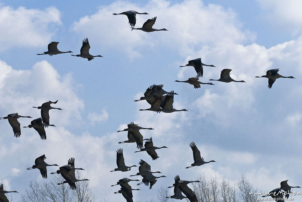 Kranich, Grauer Kranich, Grus grus, Kraniche (Gruidae), großer Trupp fliegt auf, wild and controlled, Groß Mohrdorf, Deutschland