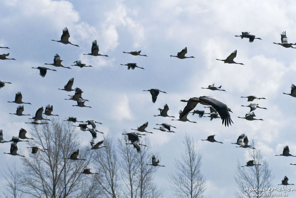 Kranich, Grauer Kranich, Grus grus, Kraniche  (Gruidae), großer Trupp fliegt auf, wild and controlled, Groß Mohrdorf, Deutschland