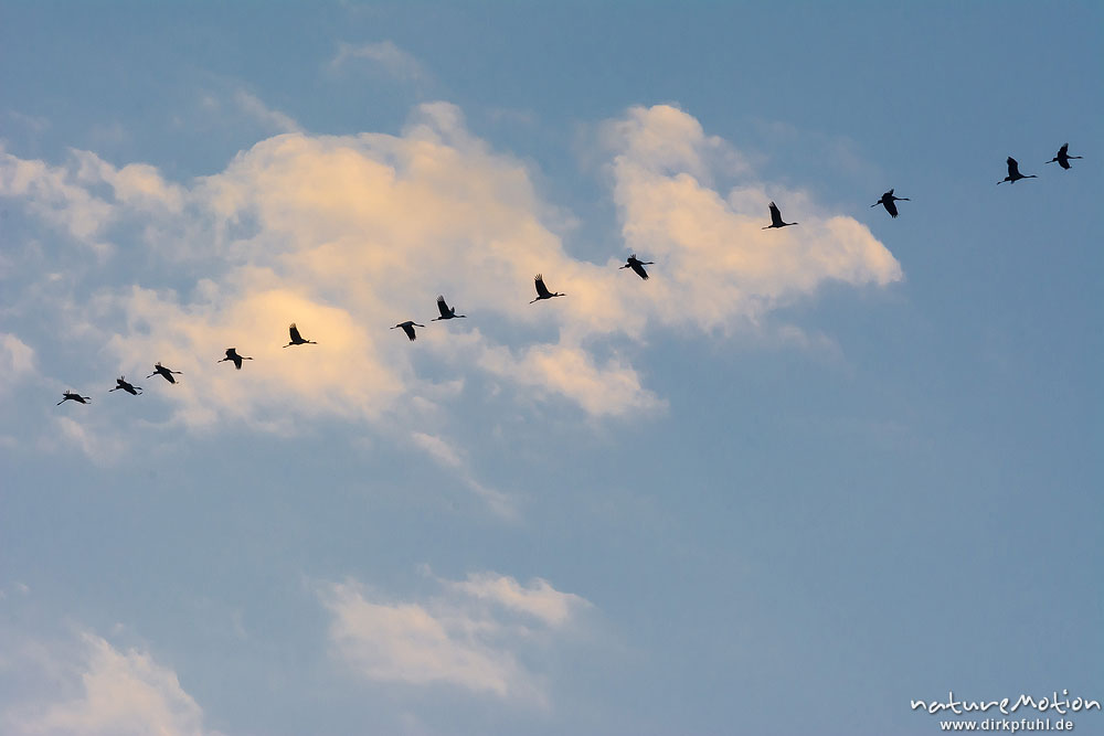 Kranich, Grauer Kranich, Grus grus, Kraniche  (Gruidae), Gruppe von Tieren fliegt in Formation zum Schlafplatz, abendlicher Einflug, Linum, A nature document - not arranged nor manipulated, Rhinluch, Deutschland