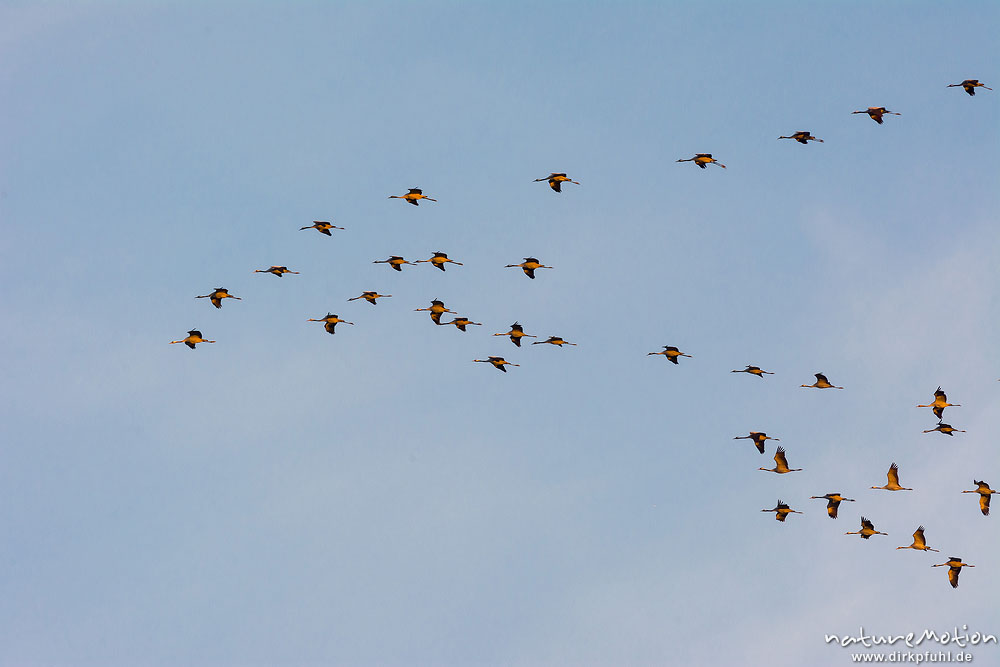 Kranich, Grauer Kranich, Grus grus, Kraniche  (Gruidae), Gruppe von Tieren fliegt in Formation zum Schlafplatz, abendlicher Einflug, Linum, A nature document - not arranged nor manipulated, Rhinluch, Deutschland