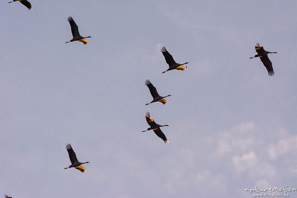 Kranich, Grauer Kranich, Grus grus, Kraniche (Gruidae), Gruppe von Tieren fliegt in Formation zum Schlafplatz, abendlicher Einflug, Linum, A nature document - not arranged nor manipulated, Rhinluch, Deutschland