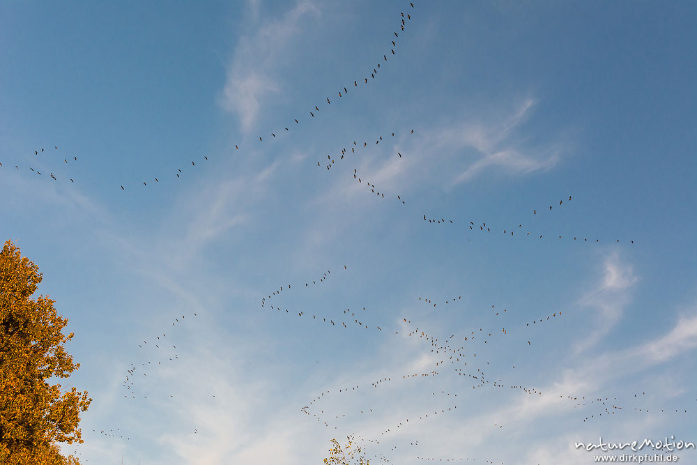 Kranich, Grauer Kranich, Grus grus, Kraniche (Gruidae), Gruppe von Tieren fliegt in Formation zum Schlafplatz, abendlicher Einflug, Linum, A nature document - not arranged nor manipulated, Rhinluch, Deutschland