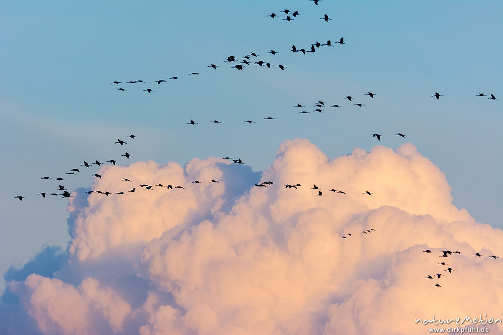 Kranich, Grauer Kranich, Grus grus, Kraniche (Gruidae), Gruppe von Tieren fliegt in Formation zum Schlafplatz, im Hintergrund tiefliegende Cumuluswolke im roten Abendlicht, abendlicher Einflug, Linum, A nature document - not arranged nor manipulated, Rhinluch, Deutschland