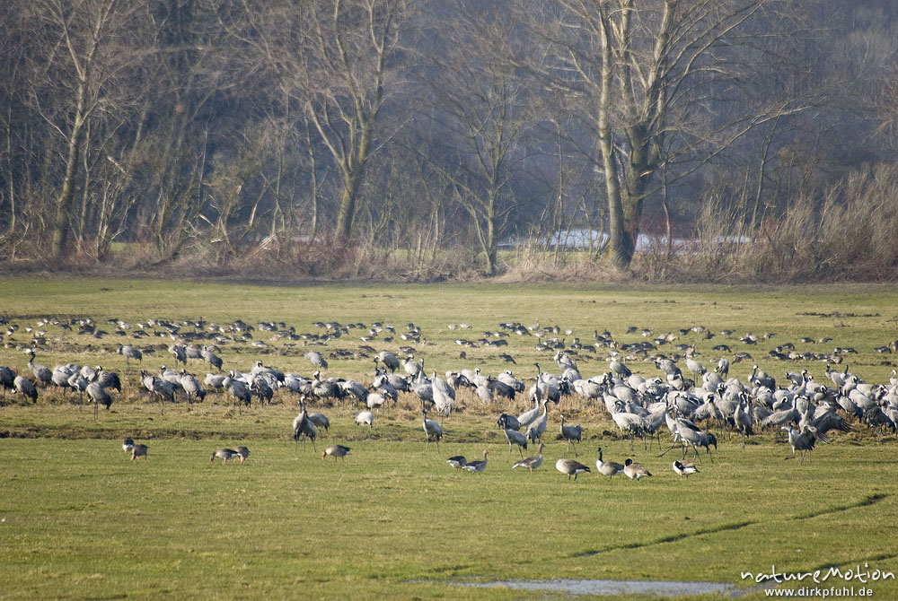 Kranich, Grauer Kranich, Grus grus, Kraniche (Gruidae), mehrere hundert Tiere beim äsen, dazwischen auch Graugänse und Kanadagänse, Günzer Wiesen, Groß Mohrdorf, Deutschland