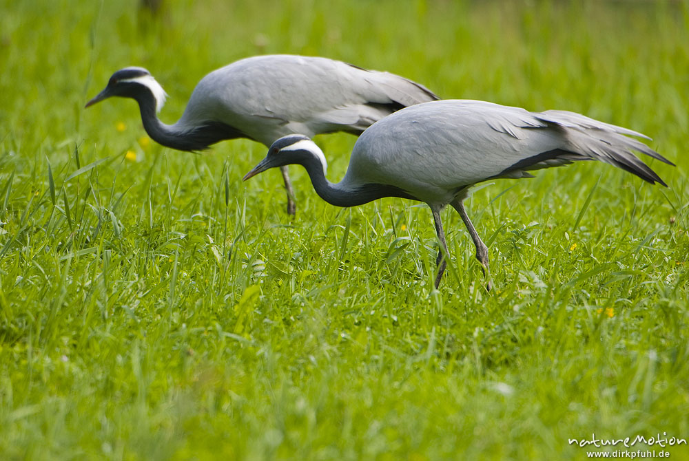 Kranich, Grauer Kranich, Grus grus, Kraniche (Gruidae), Paar auf Wiese, fressen, Gehege, Tierpark Sababurg, captive, Sababurg, Deutschland