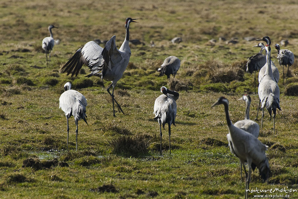 Kranich, Grauer Kranich, Grus grus, Kraniche (Gruidae), Tanz, Tier hüpft und fliegt auf der Stelle, wild and controlled, Groß Mohrdorf, Deutschland