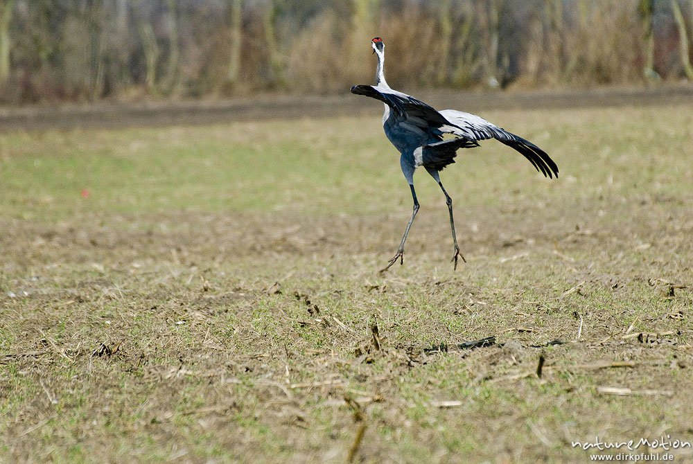 Kranich, Grauer Kranich, Grus grus, Kraniche (Gruidae), Tanz, Tier hüpft und fliegt auf der Stelle, wild and controlled, Groß Mohrdorf, Deutschland