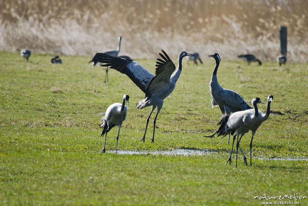 Kranich, Grauer Kranich, Grus grus, Kraniche (Gruidae), Tanz, zwei Tiere hüpfen und fliegen auf der, Groß Mohrdorf, Deutschland