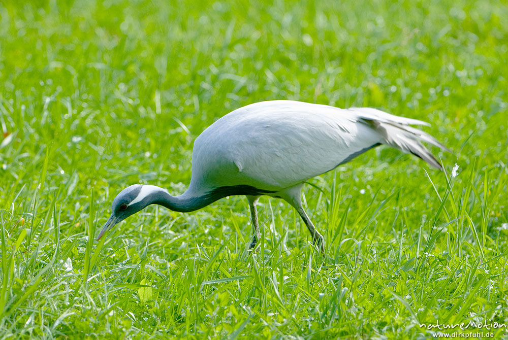 Kranich, Grauer Kranich, Grus grus, Kraniche (Gruidae), Tier auf Wiese, beim fressen, Gehege, Tierpark Sababurg, captive, Sababurg, Deutschland