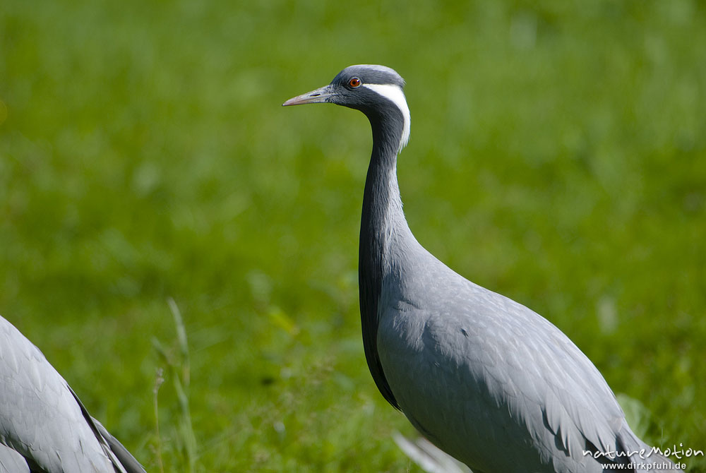 Kranich, Grauer Kranich, Grus grus, Kraniche (Gruidae), Tier auf Wiese, Teilansicht, Gehege, Tierpark Sababurg, captive, Sababurg, Deutschland