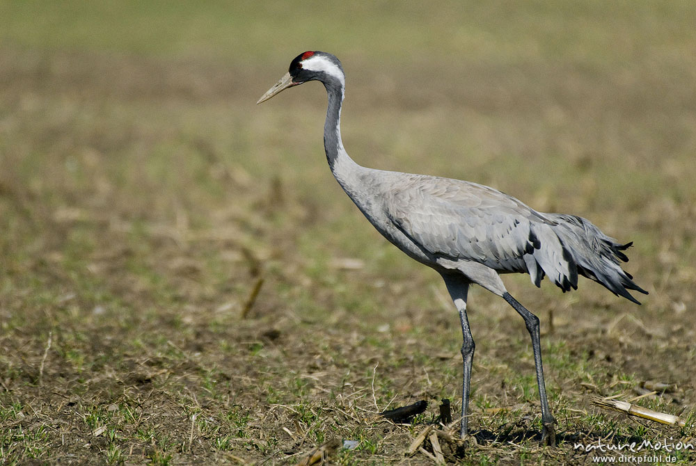 Kranich, Grauer Kranich, Grus grus, Kraniche (Gruidae), Tier beim äsen, Günzer Wiesen, wild and controlled, Groß Mohrdorf, Deutschland
