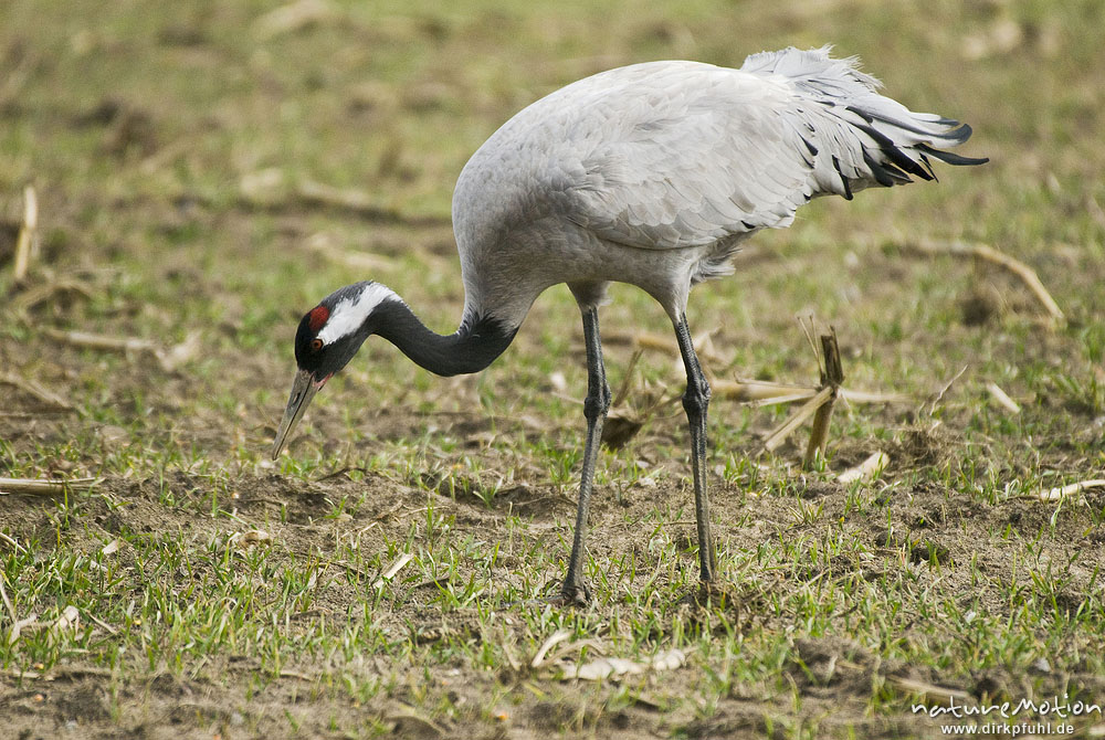 Kranich, Grauer Kranich, Grus grus, Kraniche (Gruidae), Tier beim äsen, Günzer Wiesen, wild and con, Groß Mohrdorf, Deutschland