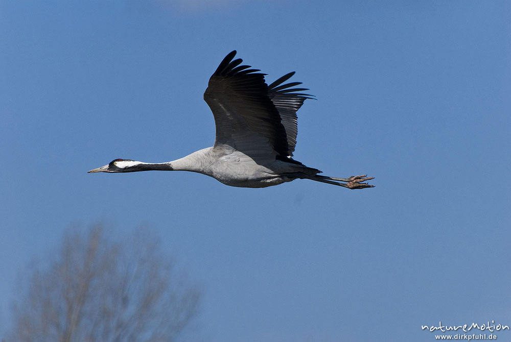 Kranich, Grauer Kranich, Grus grus, Kraniche (Gruidae), Tier fliegt ab, wild and controlled, Groß Mohrdorf, Deutschland