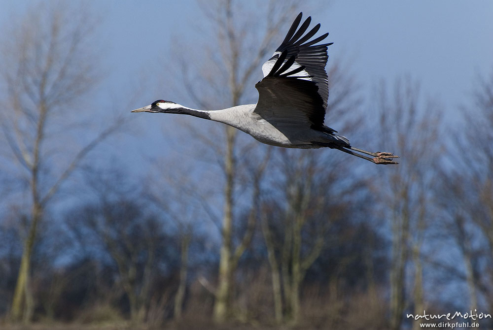 Kranich, Grauer Kranich, Grus grus, Kraniche (Gruidae), Tier fliegt ab, wild and controlled, Groß Mohrdorf, Deutschland