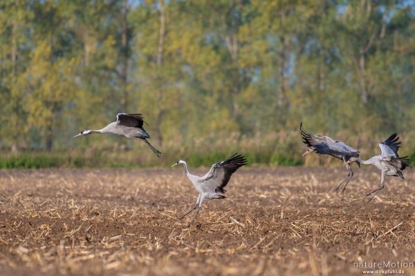 Kranich, Grauer Kranich, Grus grus, Kraniche (Gruidae), Tiere äsen auf abgeerntetem Feld, einfliegende Tiere, Paar mit 2 Jungtieren, Linum (Brandenburg), Deutschland