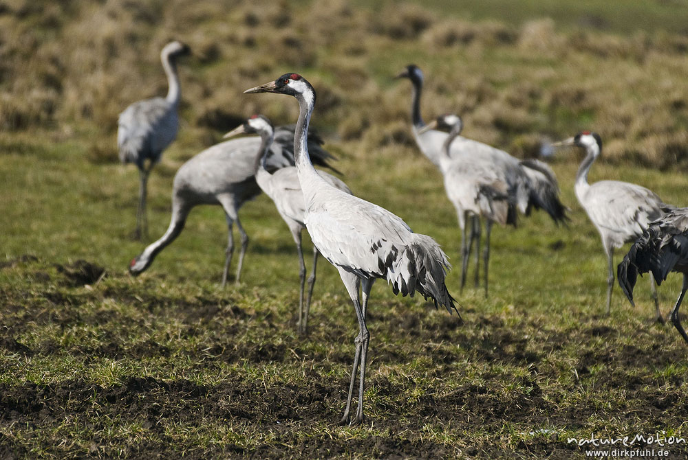 Kranich, Grauer Kranich, Grus grus, Kraniche (Gruidae), Tiere auf Wiese, gehen, äsen, wild and controlled, Groß Mohrdorf, Deutschland