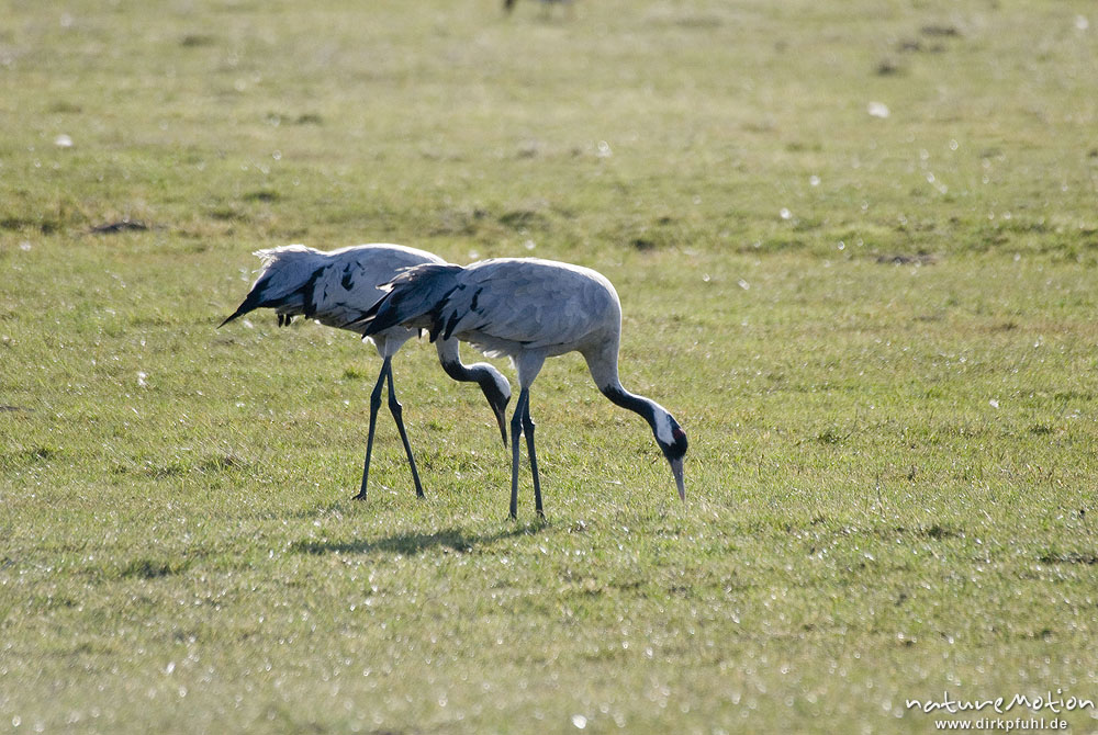 Kranich, Grauer Kranich, Grus grus, Kraniche (Gruidae), Tiere auf Wiese, gehen, äsen, wild and controlled, Groß Mohrdorf, Deutschland