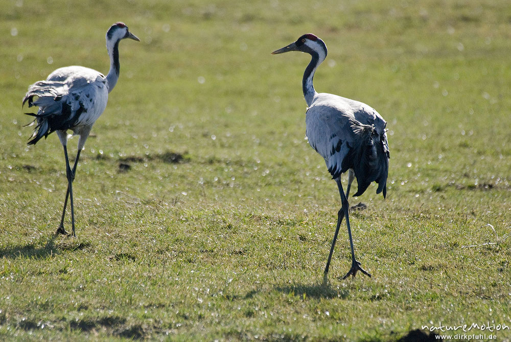 Kranich, Grauer Kranich, Grus grus, Kraniche (Gruidae), Tiere auf Wiese, gehen, äsen, wild and controlled, Groß Mohrdorf, Deutschland