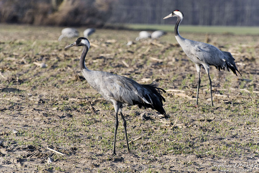 Kranich, Grauer Kranich, Grus grus, Kraniche (Gruidae), Tiere auf Wiese, gehen, äsen, wild and controlled, Groß Mohrdorf, Deutschland