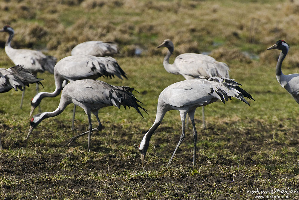 Kranich, Grauer Kranich, Grus grus, Kraniche (Gruidae), Tiere beim äsen, Günzer Wiesen, wild and controlled, Groß Mohrdorf, Deutschland