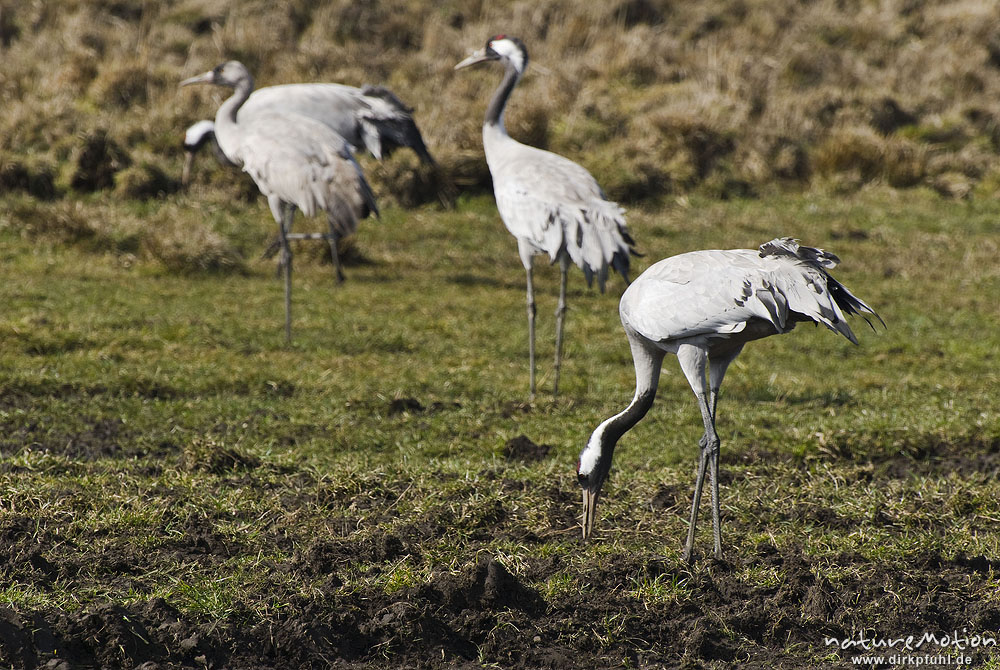 Kranich, Grauer Kranich, Grus grus, Kraniche (Gruidae), Tiere beim äsen, Günzer Wiesen, wild and controlled, Groß Mohrdorf, Deutschland