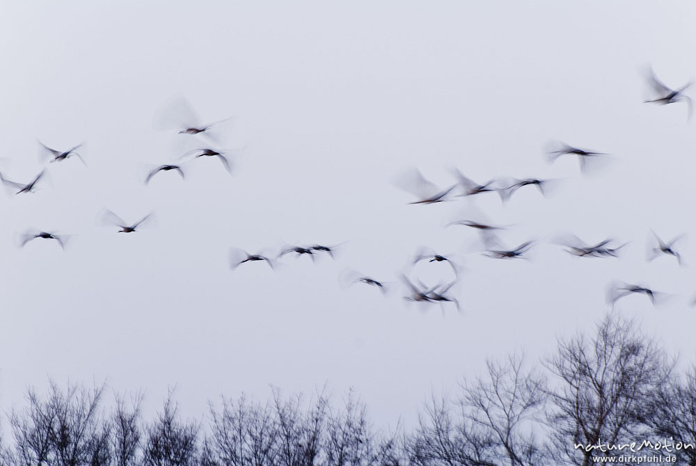 Kranich, Grauer Kranich, Grus grus, Kraniche (Gruidae), Trupp von 10 bis 20 Tieren fliegt ab zum Schlafplatz, wild and controlled, Groß Mohrdorf, Deutschland