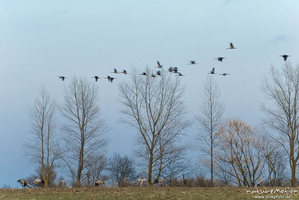 Kranich, Grauer Kranich, Grus grus, Kraniche (Gruidae), Trupp von 10 bis 20 Tieren fliegt ab zum Schlafplatz, wild and controlled, Groß Mohrdorf, Deutschland
