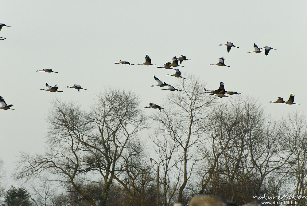 Kranich, Grauer Kranich, Grus grus, Kraniche (Gruidae), Trupp von 10 bis 20 Tieren fliegt ab zum Schlafplatz, wild and controlled, Groß Mohrdorf, Deutschland