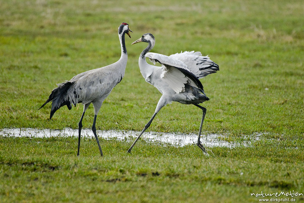 Kranich, Grauer Kranich, Grus grus, Kraniche (Gruidae), zwei Tiere bei Streit, wild and controlled, Groß Mohrdorf, Deutschland