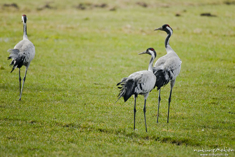Kranich, Grauer Kranich, Grus grus, Kraniche (Gruidae), zwei Tiere schauen vorbeigehendem Tier nach, Groß Mohrdorf, Deutschland