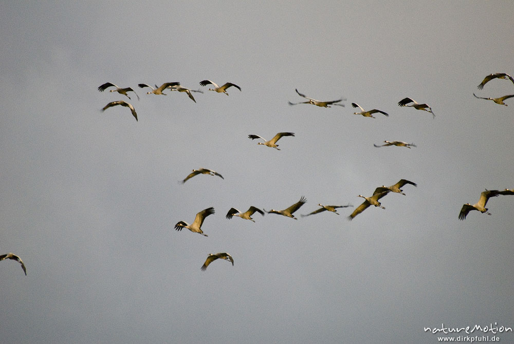 Kranich, Grus grus, Gruidae, Gruppe im Anflug zum nächstlichen Rastplatz am Rederangsee, Müritz-Nationalpark, Deutschland