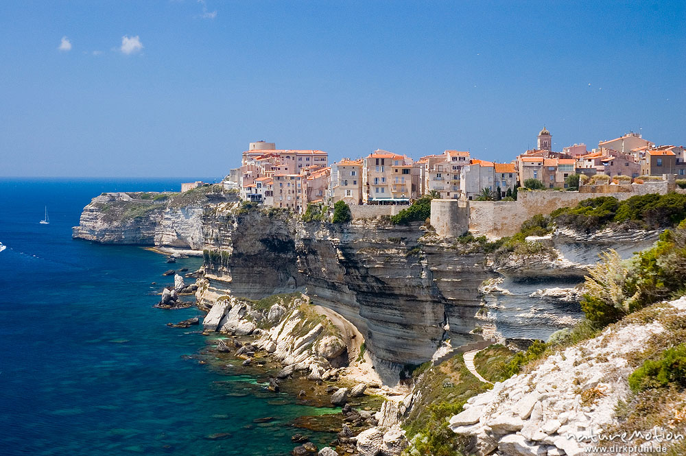 Kreidefelsen von Bonifacio, Häuser am Klippenrand über dem Meer Korsika, Frankreich