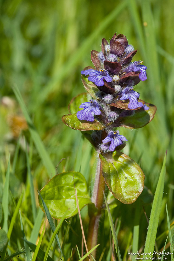 Kriechender Günsel, Ajuga reptans, Lippenblütengewächse (Lamiaceae), ganze Pflanze mit Blütenstand, Tal der Kobbeke, Hardegsen bei Göttingen, Deutschland