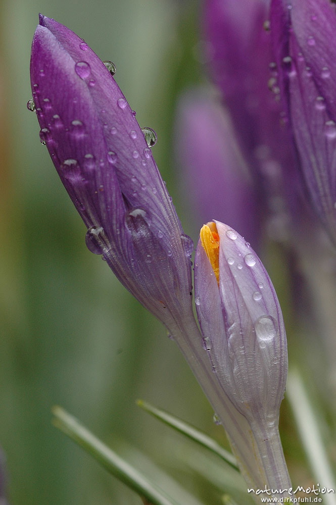 Krokus, Crocus sp., geschlossene Blüten mit Regentropfen, Garten, Göttingen, Deutschland