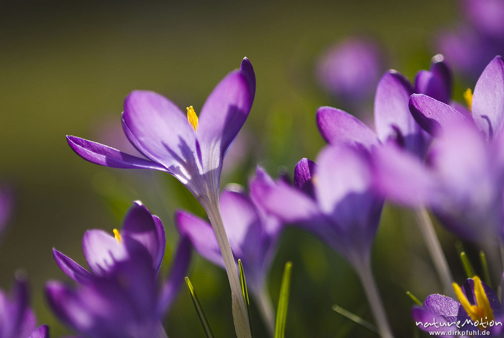 Krokus, Crocus vernus, Iridaceae, Blüten mit gelben Staubfäden, Gegenlicht, Garten, Göttingen, Deutschland