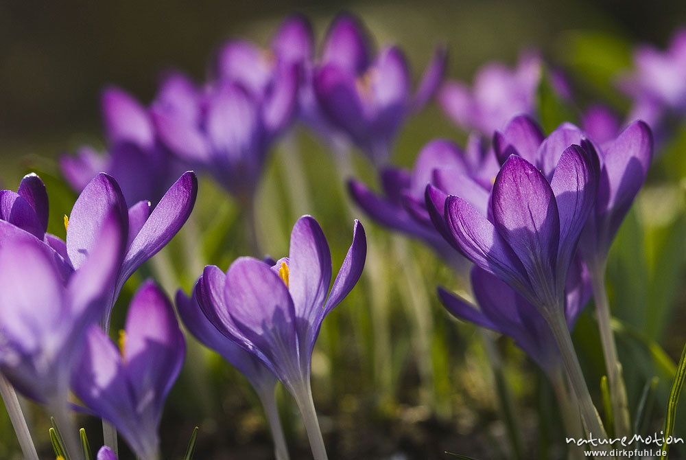 Krokus, Crocus vernus, Iridaceae, Blüten mit gelben Staubfäden, Gegenlicht, Garten, Göttingen, Deutschland