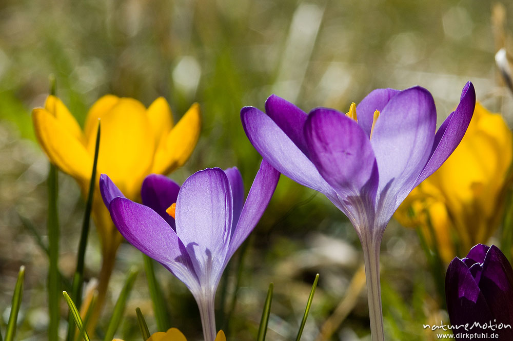 Krokus, Crocus vernus, Iridaceae und Gelber Krokus, Crocus chrysanthus, violette und gelbe Blüten, Göttingen, Deutschland