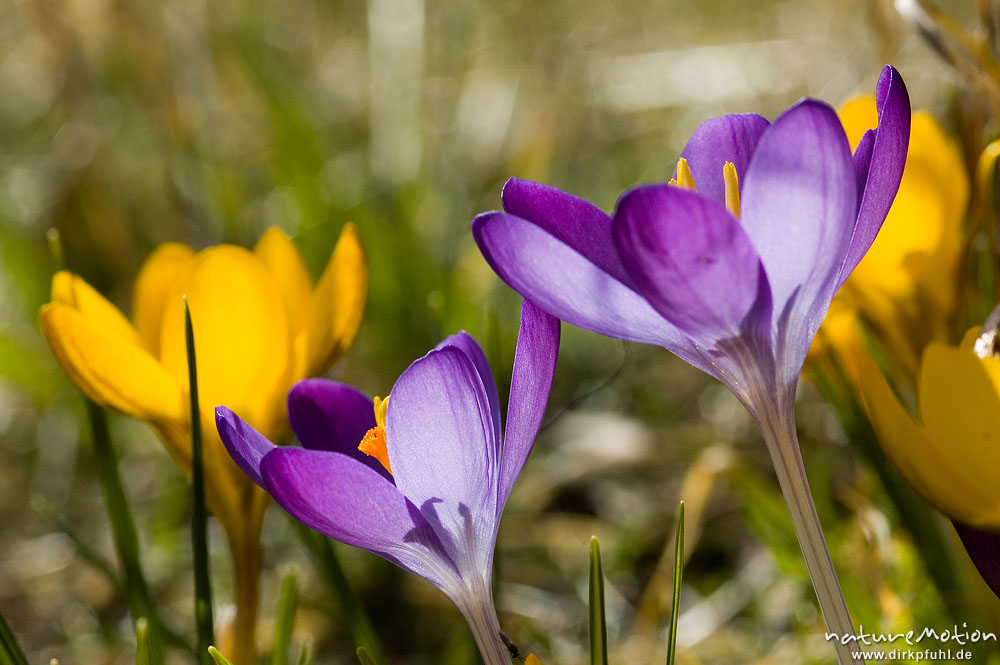 Krokus, Crocus vernus, Iridaceae und Gelber Krokus, Crocus chrysanthus, violette und gelbe Blüten, Göttingen, Deutschland