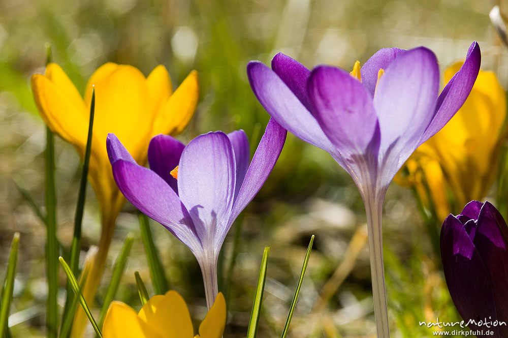 Krokus, Crocus vernus, Iridaceae und Gelber Krokus, Crocus chrysanthus, violette und gelbe Blüten, Göttingen, Deutschland