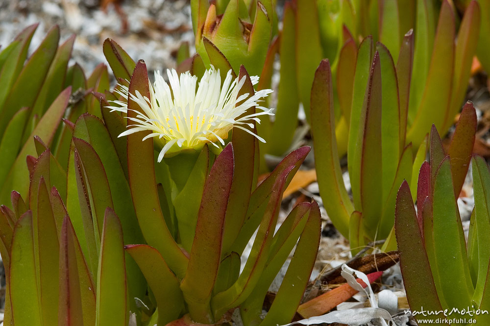 Küstenmittagsblume, Carpobrotus edulis, Aizoaceae, Blüte und Blätter, Stand bei Palombaggia Korsika, Frankreich