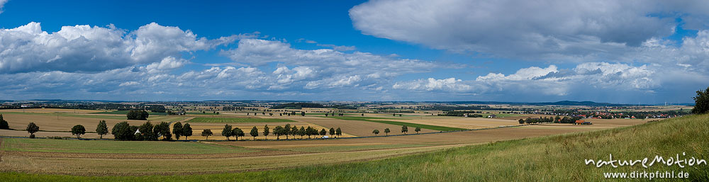 Kulturlandschaft mit Getreidefeldern, Feldwegen, Rainen und Windrädern, Desenberg, Umland von Warburg, Warburg, Deutschland