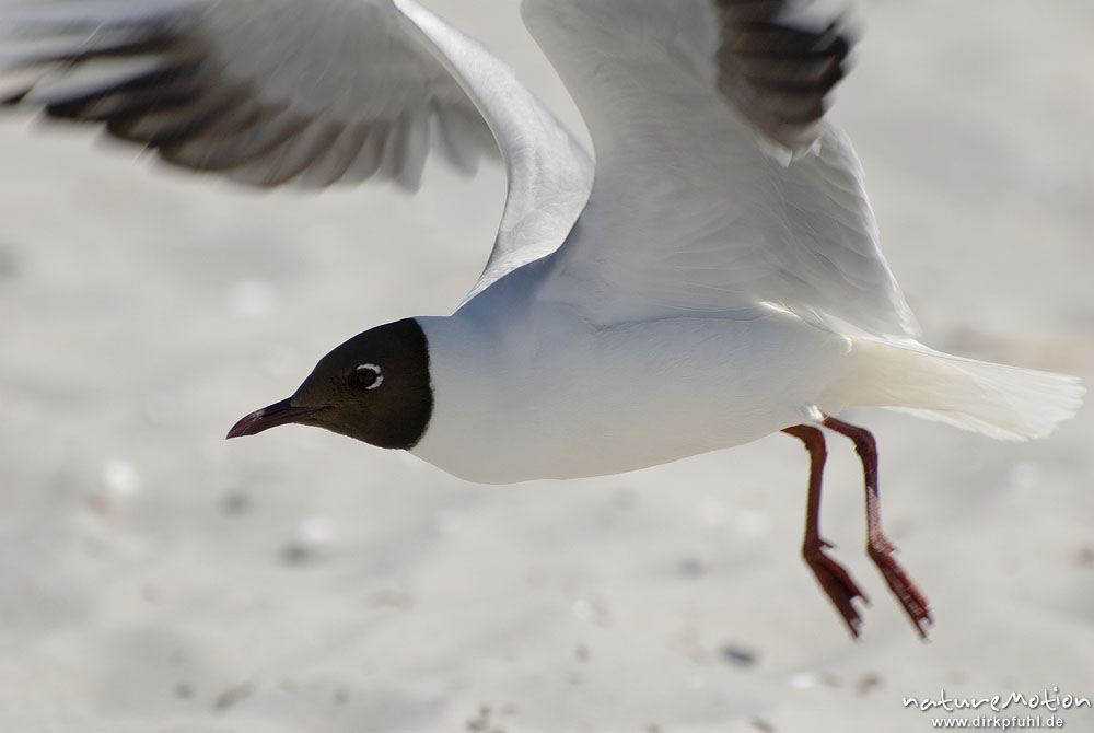 Lachmöwe, Larus ridibundus, Laridae, fliegt auf, Abflug, Strand von Prerow, Darß, Zingst, Deutschland