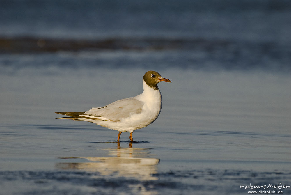 Lachmöwe, Larus ridibundus, Laridae, Tier bei der Nahrungssuche im Flachwasser an der Wasserkante, spiegelt sich im Wasser, Strand von Prerow, Darß, Zingst, Deutschland