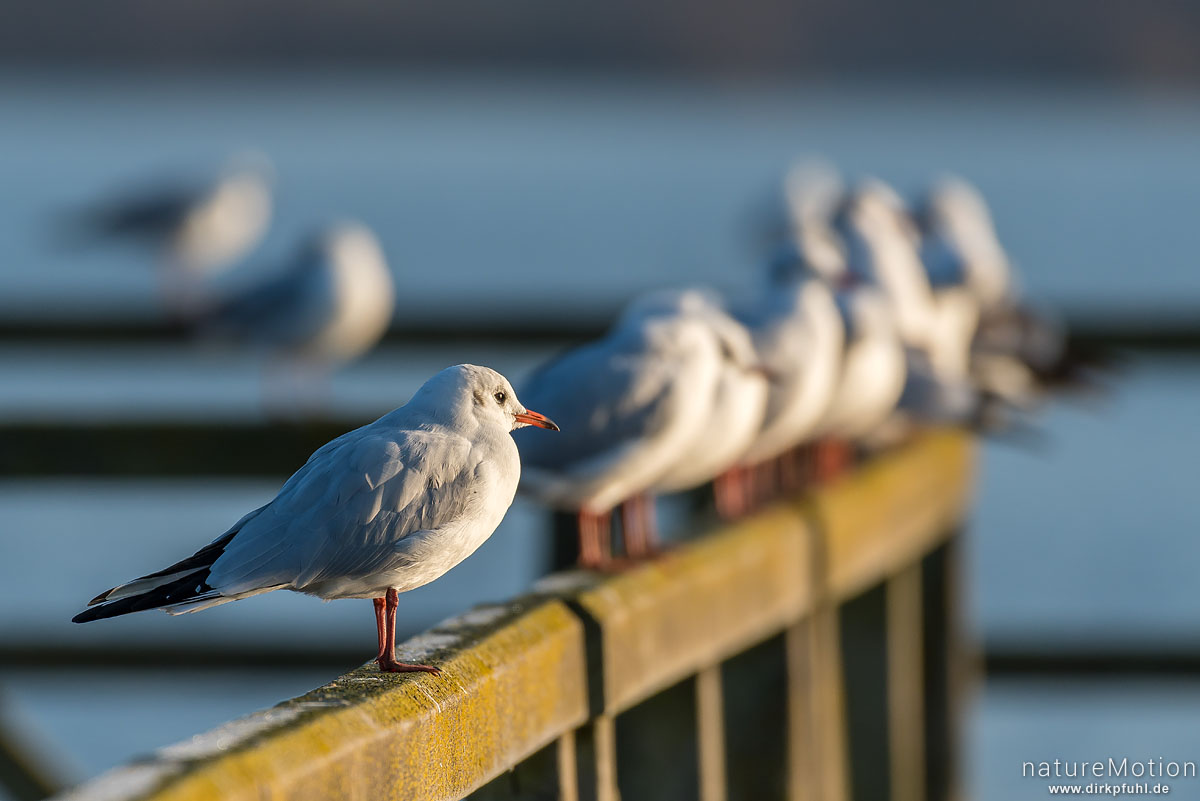 Lachmöwe, Larus ridibundus, Laridae, Tiere sitzen auf Geländer von Badesteg, Seeburger See, Seeburger See, Deutschland