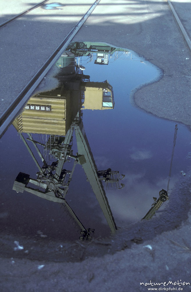 Ladekran am Kai, Spiegelung in Pfütze, Kristinehamn, , Schweden